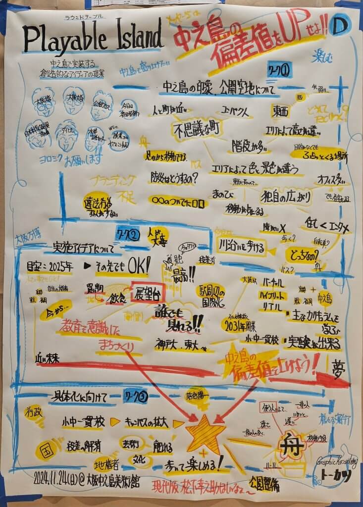 会議、講演、ワークショップなどの内容を、リアルタイムで図やイラスト、文字を使って視覚的に記録する手法です。