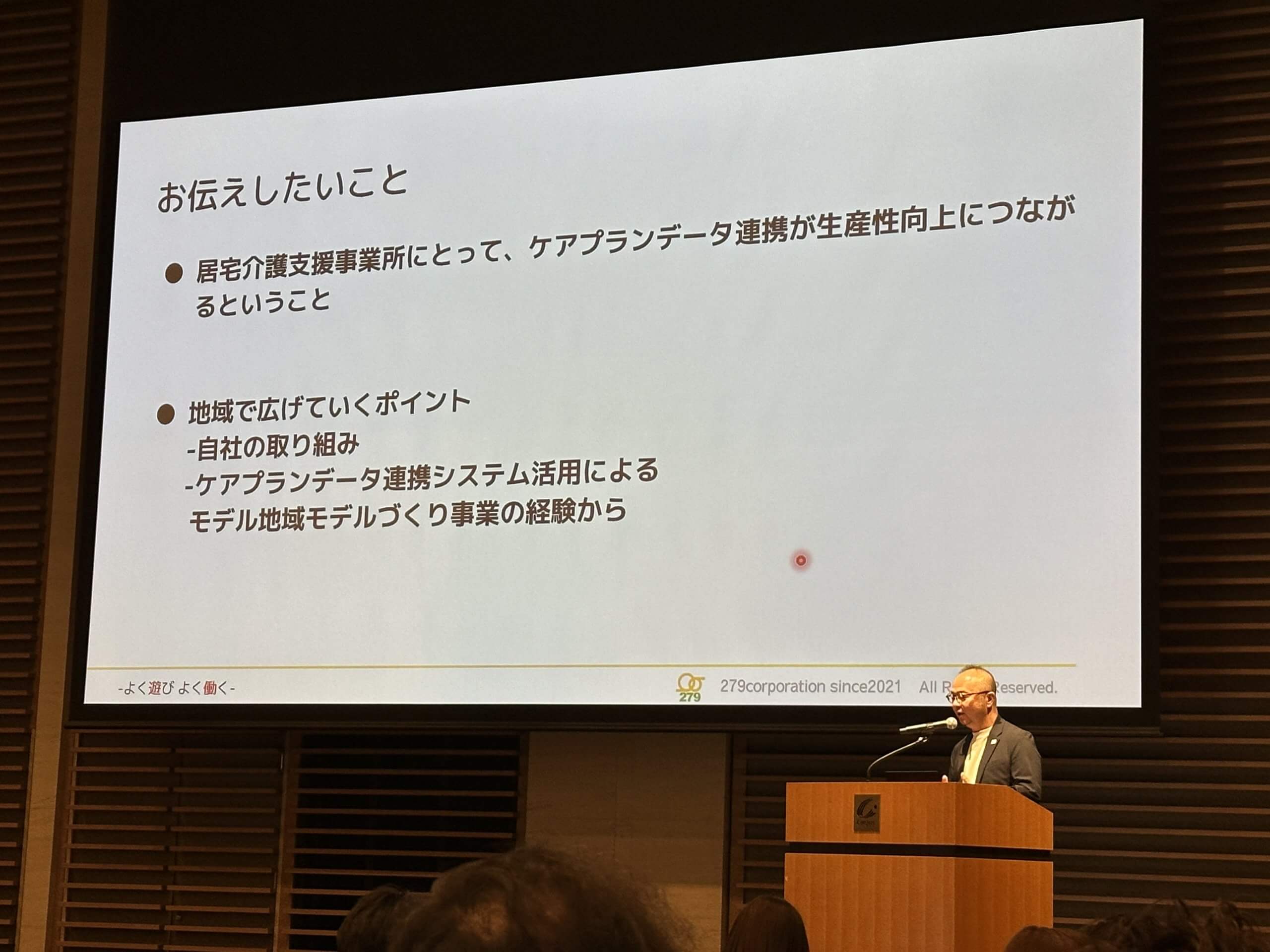 ITを活用した革新的な取り組みで注目される株式会社279の代表取締役であり、当法人の理事も務めるツクツク氏は、ケアプランデータ連携システムを活用した業務効率化と生産性向上の具体策について発表した。