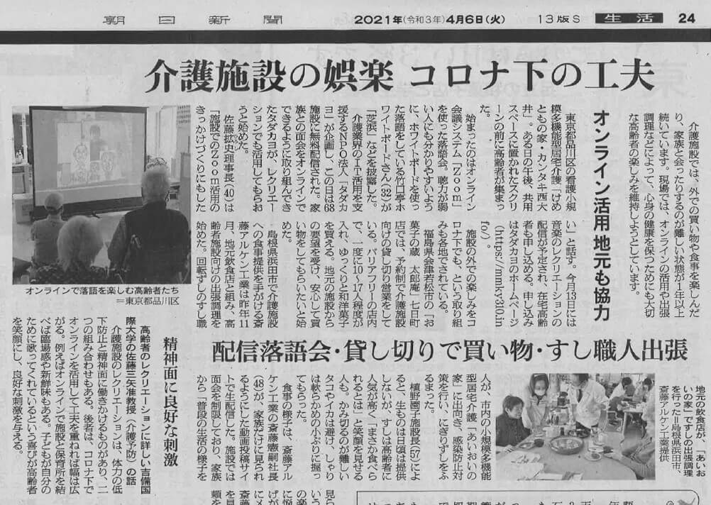 4/6 朝日新聞社さまの朝刊(全国版)に取り上げて頂きました。