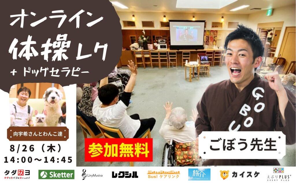 受付終了【8/26開催】ごぼう先生による無料オンライン体操レク + オンライン動物介在介護(ドッグセラピー)