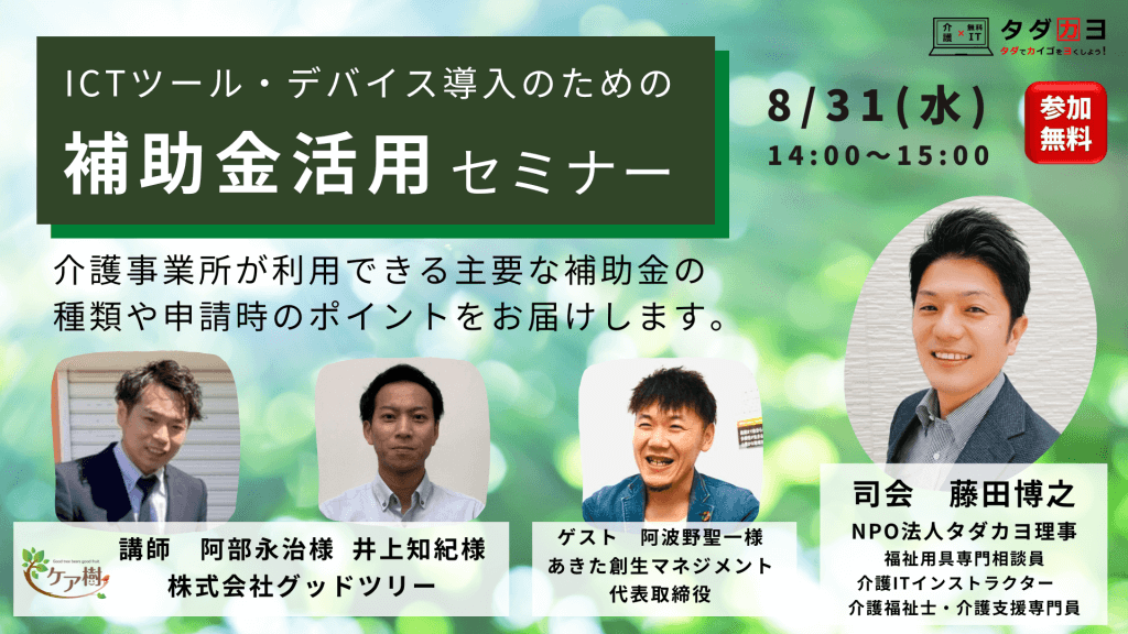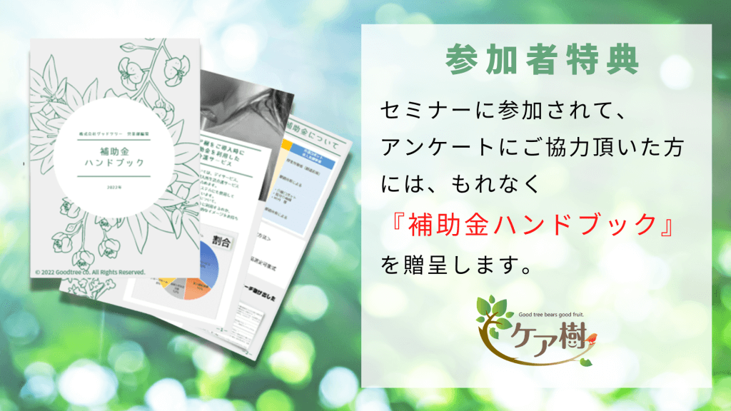そこで本セミナーでは、多くの介護事業所の補助金申請をサポートされている株式会社グッドツリー様をお招きして、補助金の種類や要件、申請書の書き方などのポイントについて解説して頂きます。