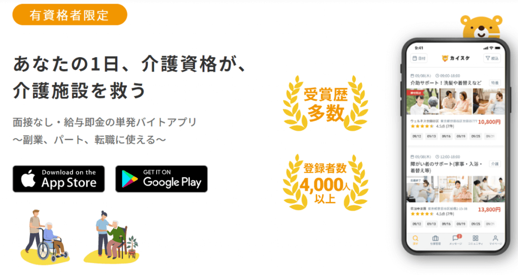 カイスケは、介護の有資格者が、面接なし・給与即金で単発アルバイトができるアプリです。