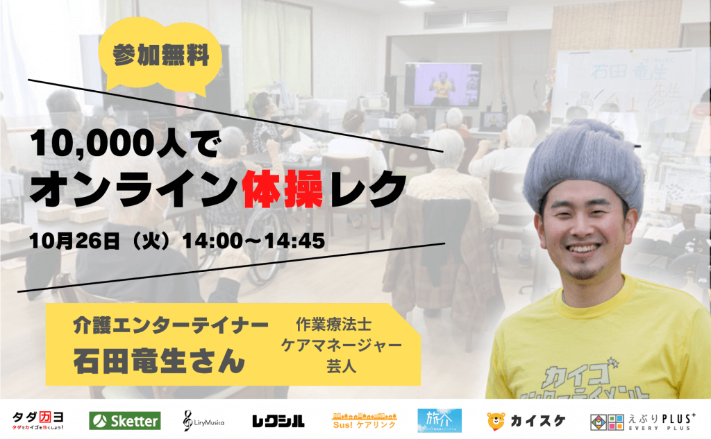NPO法人タダカヨは、コロナ禍のご高齢者に楽しみを届けたいという想いから、介護ソーシャルベンチャー7社と共に「無料オンラインレク」を毎月開催しています。第11回目となる今回は、介護エンターテイナー石田竜生さんによる体操レクを開催致します。