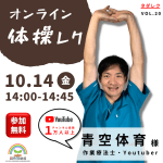 2022年9月17日 / 最終更新日 : 2025年12月4日 takeshi-maekawa タダレク:無料オンラインレク 受付終了【10/14開催】オンライン体操 青空体育さんの介護予防レク タダレクVol.20 NPO法人タダカヨは、コロナ禍のご高齢者に楽しみを届けたいという想いから、無料オンラインレクイベント「タダレク」を毎月開催しています。第20回目となる今回は、YouTubeチャンネル「青空体育の介護予防クラブ」でおなじみ […]