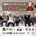 2022年11月10日 / 最終更新日 : 2025年12月4日 takeshi-maekawa タダレク:無料オンラインレク 受付終了【11/28開催】無料オンラインレク 「座ソーラン × リハビリ体操 × 紙芝居」 タダレク vol.21 NPO法人タダカヨは、コロナ禍のご高齢者に楽しみを届けたいという想いから、無料オンラインレクイベント「タダレク」を毎月開催しています。第21回目となる今回は、なんと2組の個性豊かなレクリエーションとなります。竹口亭ホワイ […]
