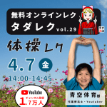 2023年3月28日 / 最終更新日 : 2025年12月4日 takeshi-maekawa タダレク:無料オンラインレク 受付終了【4/7開催】オンライン体操 青空体育さんの介護予防レク タダレクVol.29 NPO法人タダカヨは、コロナ禍のご高齢者に楽しみを届けたいという想いから、無料オンラインレクイベント「タダレク」を毎月開催しています。第29回目となる今回は、前回大好評だったYouTubeチャンネル「青空体育の介護予防ク […]