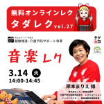 2023年3月8日 / 最終更新日 : 2025年12月4日 ヒロス タダレク:無料オンラインレク 受付終了【3/14開催】オンライン音楽レク(フカノ楽器店さま・音楽サロン) タダレクVol.27 NPO法人タダカヨは、コロナ禍のご高齢者に楽しみを届けたいという想いから、無料オンラインレクイベント「タダレク」を毎月開催しています。第27回目となる今回は、これまで延べ30万人の高齢者様が参加されてきたフカノ楽器店様の […]