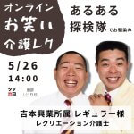 2022年5月26日 / 最終更新日 : 2025年12月4日 千恵子中門 タダレク:無料オンラインレク 5/26 無料オンラインレク「タダレクvol.15」あるある探検隊♪オンライン介護レク 開催しました タダカヨは、コロナ禍のご高齢者に楽しみを届けたいという想いから、「無料オンラインレク」を開催しています。 第15回目となる今回は、吉本興行様にご協力いただき、「あるある探検隊」でお馴染みのレギュラーのお二人による「オンラ […]