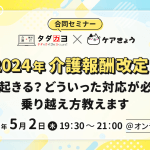2024年4月24日 / 最終更新日 : 2024年9月22日 ichichi タダスク:無料オンラインスクール 受付終了【5/2 開催】タダカヨ×ケアきょう合同セミナー!2024年大ニュース 介護報酬改定!何が起きるか分かる!乗り越え方がわかる! 2024年は介護報酬改定があり、業界はまた大きく変わりました。介護のお仕事に大きな影響を与える今回の報酬。どのような影響が起きるのか?どういった対応が必要なのか?解説していただきます。 介護系メディア№1フォロワー数のケ […]