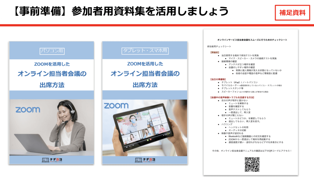 そこで今回の資料集には、パソコン、タブレット&スマホ用の 出席者マニュアルも用意しておりますのでこちらもご活用ください。
