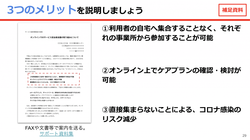 オンライン会議自体に参加したことがなくて不安であったり、ICTが苦手な方もいるので、そのような方には「オンラインサービス担当者会議 参加者用の資料」を用いて説明をしてください。