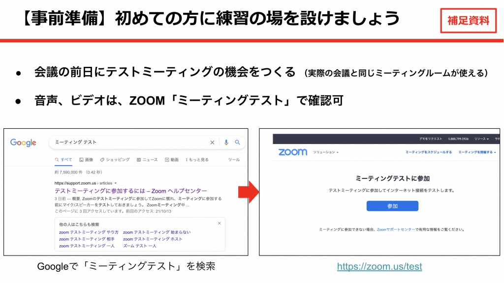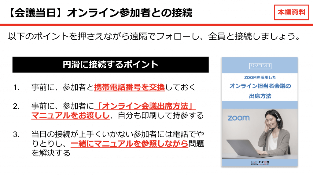- 参加者に「オンライン会議出席方法」マニュアルをお渡しし、自分も印刷して持参する
