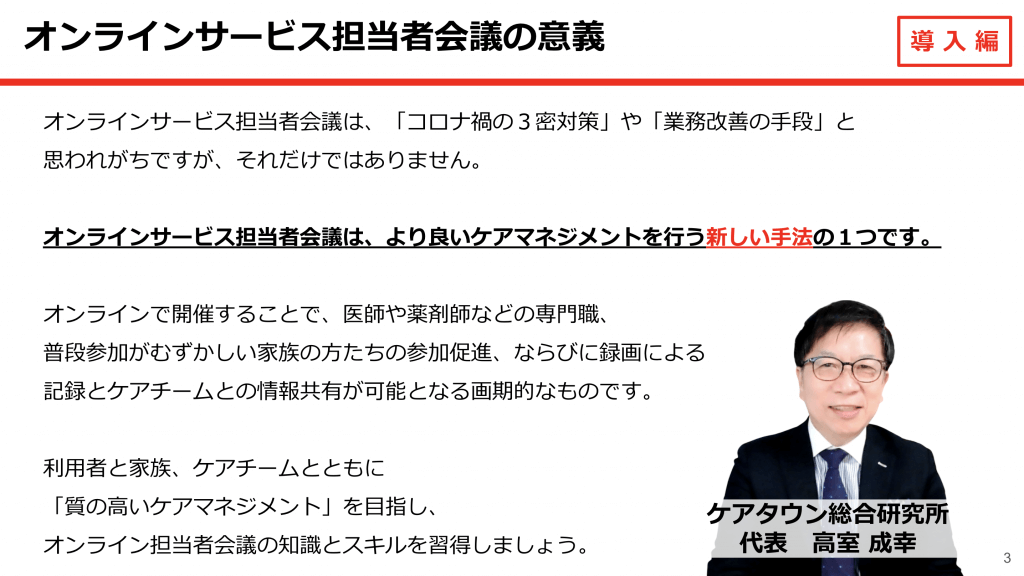 利用者と家族、ケアチームとともに「質の高いケアマネジメント」を目指し、オンライン担当者会議の知識とスキルを習得しましょう。