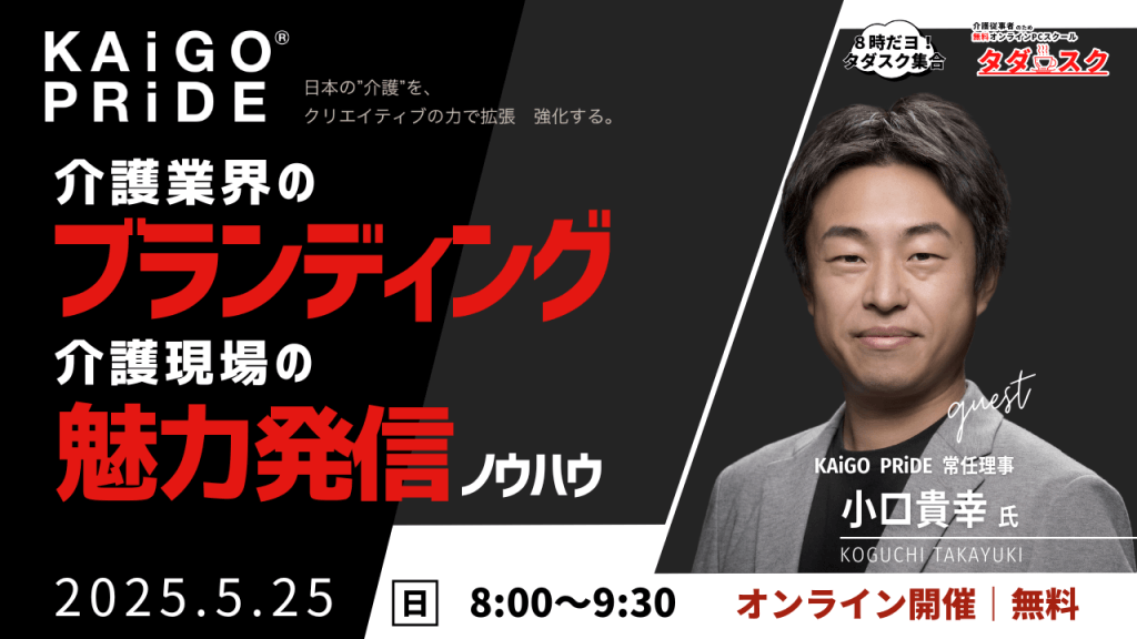 今回の8時だョタダスク集合では、KAiGO PRiDE の 小口 貴幸氏 を講師に迎え、介護業界のブランディング、介護現場の魅力発信ノウハウを話していただきます!