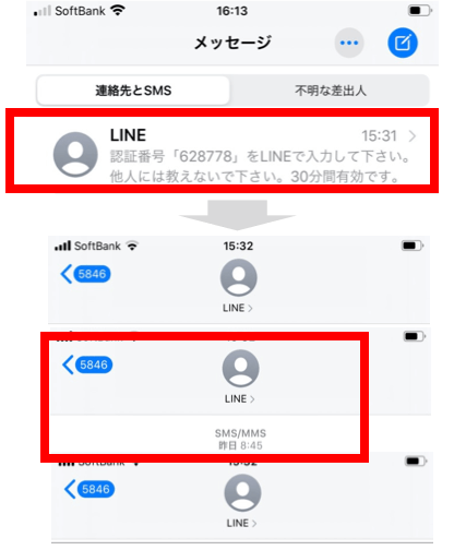 9.LINEからメッセージが届いているので、開き、認証番号を控える。