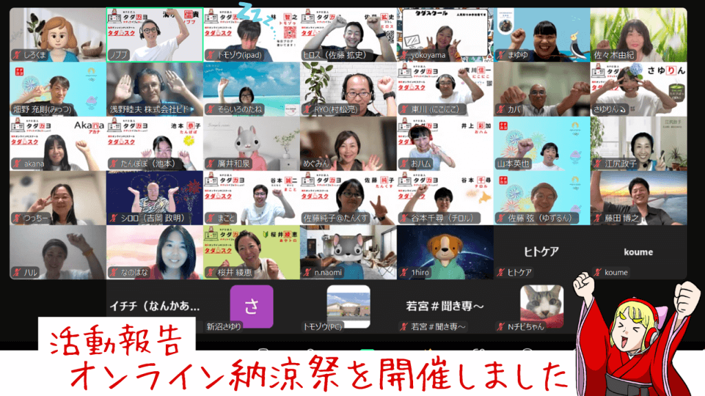 2024年8月25日、タダスク講師と受講生の交流会として、オンラインで「納涼祭」を開催しました。当日は多くの方にご参加いただき、講師と受講生が垣根を越えたリラックスした雰囲気の中で交流が行われました。また、参加者全員が楽しめるプログラムが満載で、充実した時間を共有することができました。