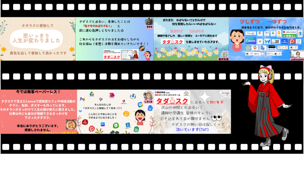 この度は、AI適切なケアマネジメント手法で行う事例検討会にご参加いただき、誠にありがとうございました。AI技術は日々進化を遂げており、タダスクやAI講座もこれからさらに進化し続けます。皆様のご支援のおかげで、スクールでも高い評価をいただき、賞を受賞することができました。これからも変わらぬ応援をよろしくお願いいたします。