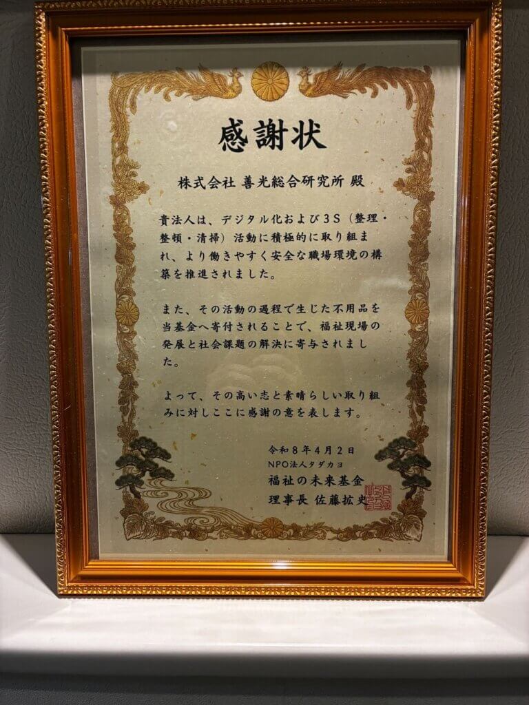 NPO法人タダカヨが運営する「福祉の未来基金」へ、多大なるご支援を賜りました株式会社善光総合研究所様に対し、感謝状の贈呈式を執り行いました。