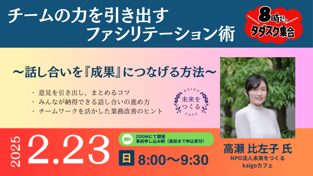 NPO法人「未来をつくるkaigoカフェ」代表の高瀬比左子氏を講師にお迎えし、介護現場におけるチームの力を最大限に引き出すためのファシリテーション術を学ぶオンラインセミナーを開催いたしました。「会議がなかなかスムーズに進まない」「チームの意見をもっと引き出したい」といった課題感をお持ちの多くの方にご参加いただきました。