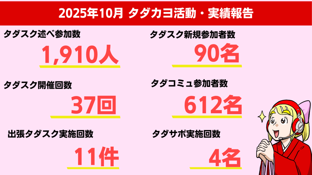2025年10月も、オンライン・オフラインを問わず、全国の介護従事者の皆様の「学びたい」「困った」に応えるべく、多岐にわたる活動を実施いたしました。特に「出張タダスク」(無料団体研修)を全国9件実施し、奈良、滋賀、佐賀、福井、青森など全国の地域特有の課題解決を徹底サポートできたことは、大きな喜びとなりました。