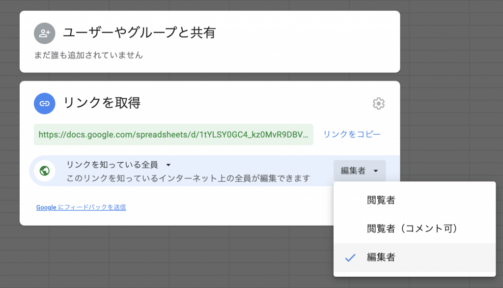 相手には「閲覧可」「コメント可」「編集可」という具合に権限も自由に設定できますので共有する相手に合わせてアクセスレベルを自由に設定することができます。