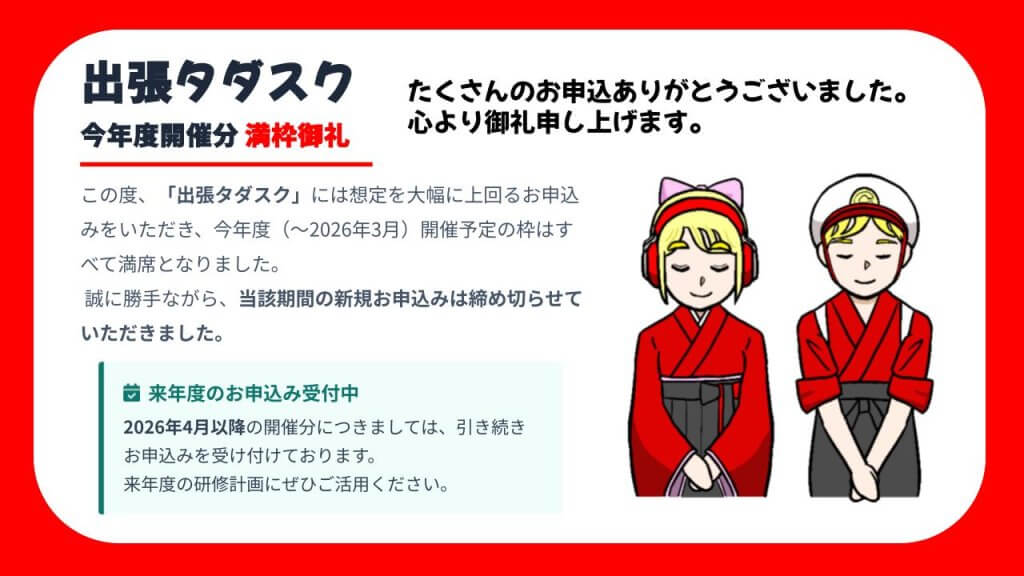 平素は「出張タダスク」に対し、多大なるご関心と温かいご支援を賜り、誠にありがとうございます。