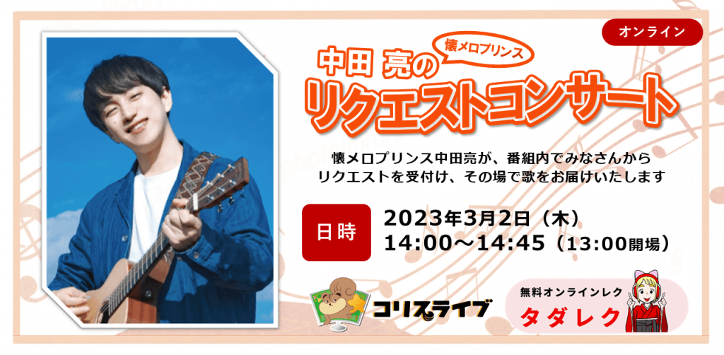 受付終了【3/2開催】懐メロプリンス中田亮さまによるリクエストコンサート タダレクVol.26