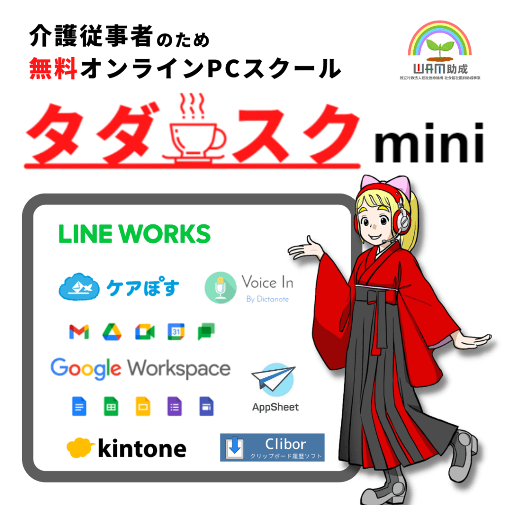 タダカヨは、これまで「介護従事者のための無料オンラインPCスクール タダスク」を定期開催し、累計1,000名以上の方に参加して頂きました。「タダスクmini」では、過去タダスクで取り上げ好評だったテーマを中心に、少人数制の体験型ICT研修をお届けします。*本非営利活動は、独立行政法人福祉医療機構(WAM)様の助成によって実施しています。