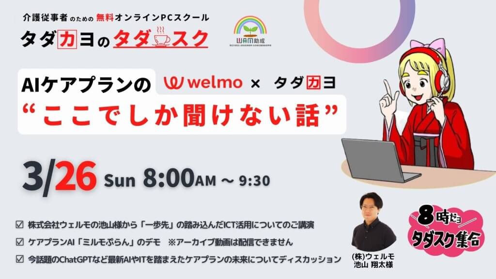 3/26(日)8:00〜9:30 『8時だョタダスク集合』 は「AIケアプランの ❝ここでしか聞けない話❞」