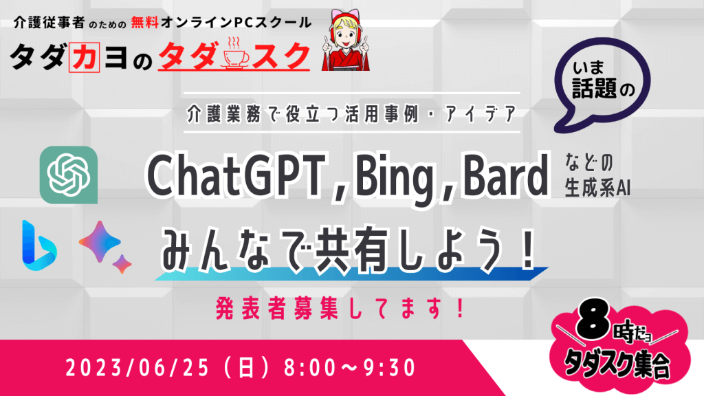 NPO法人タダカヨは、介護従事者のITスキルアップを応援したいという想いから、介護従事者に限定した無料PCスクール「タダカヨのタダスク」を開催しています。参加無料、オンライン開催、見学のみも可能ですので、お気軽にご参加ください。