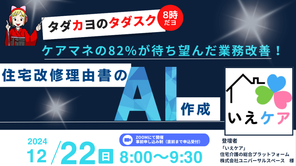 受付終了【12/22開催】ケアマネの82%が待ち望んだ業務改善!住宅改修理由書のAI作成!~8時だョタダスク集合!~